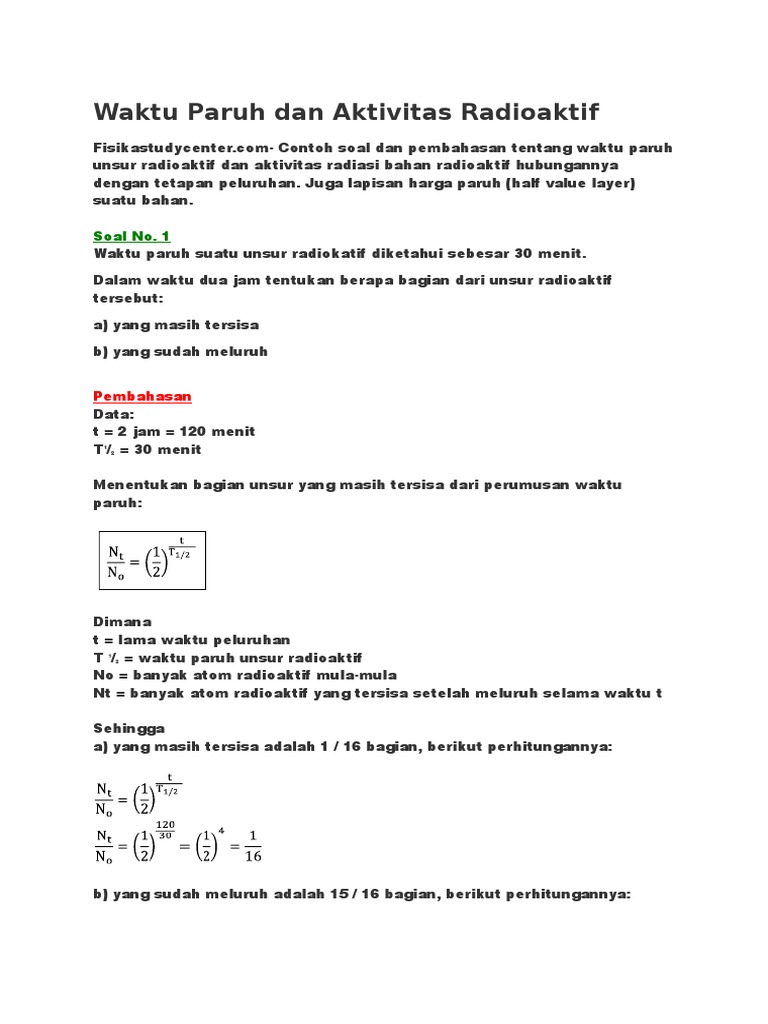 Contoh soal waktu paruh. Pilih satuan waktu yang sesuai. Sesuai pengertiannya waktu paruh ialah waktu yang dibutuhkan suatu isotop radioaktif unsur untuk meluruh hingga setengahnya dari jumlah sampel. Satuan lain silakan disesuaikan dengan keperluan penyelesaian soal latihan. Juga lapisan harga paruh half value layer suatu bahan. Anda dapat menawarkan untuk scanning penyimpanan dan layanan arsip untuk dokumen dan foto. 1 waktu paruh suatu unsur radiokatif diketahui sebesar 30 menit.