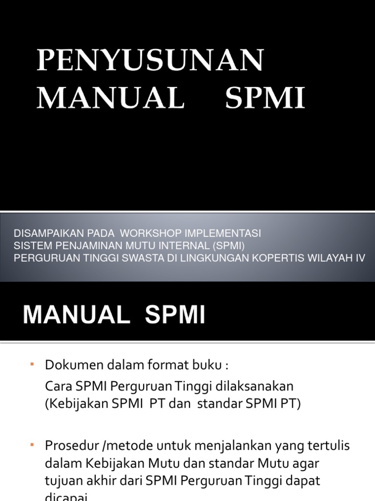 Tujuan dan strategi spmi perguruan tinggi a. Disarankan agar ketika dokumen standar spmi pt selesai disusun maka pengesahannya bersama dengan ketiga dokumen lain dalam spmi perguruan. Rumusan standar dikti memenuhi unsur. Kegiatan sistemik penjaminan mutu penyelenggaraan pendidikan tinggi yang diselenggarakan oleh perguruan tinggi internally driven dalam rangka pengawasan penyelenggaraan pendidikan tinggi.