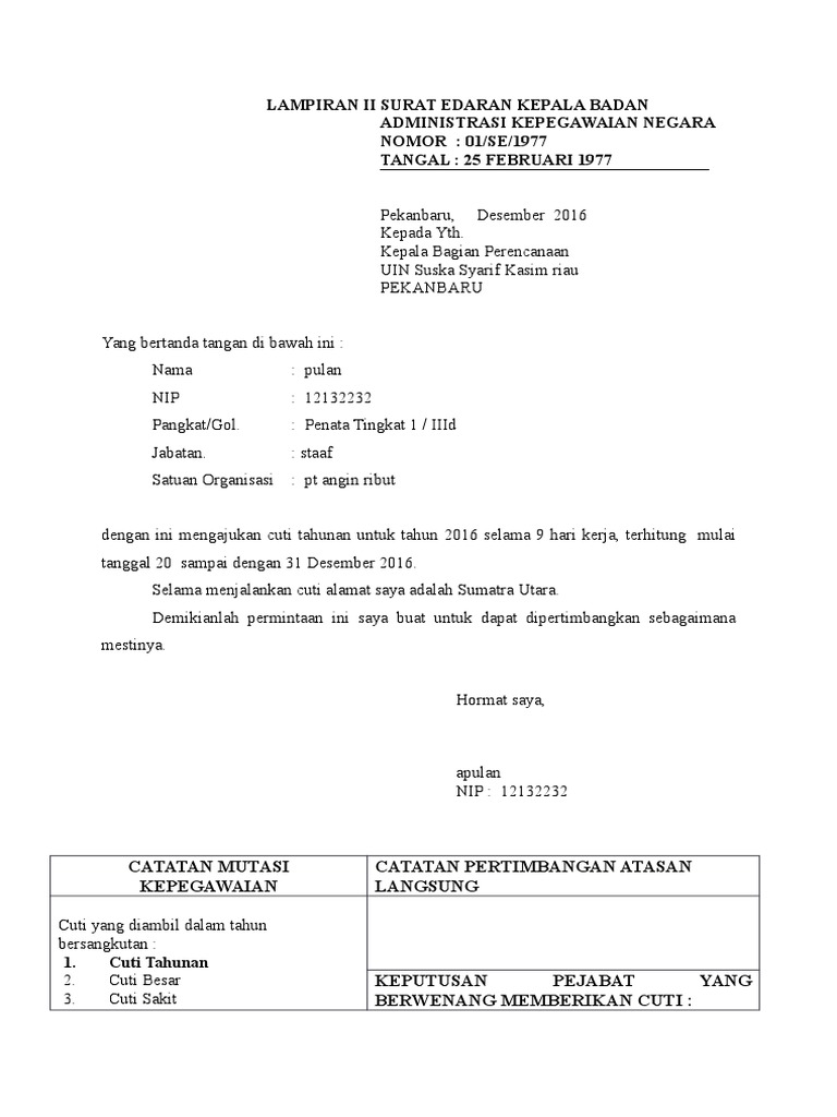 Contoh surat cuti pada umumnya setiap orang yang bekerja memiliki hak untuk cuti pada waktu waktu tertentu. Contoh surat izin cuti pada lingkungan kerja setiap karyawanburuh memiliki hak untuk cuti seperti cuti kerja tahunan cuti melahirkan cuti menikah ataupun cuti sakit. Beberapa contoh surat permohonan cuti kerja tahunan pns yang baik dan benar 2019. Contoh surat permohonan cuti kerja tahunan pns have a graphic from the othercontoh surat permohonan cuti kerja tahunan pns it also will feature a picture of a kind that might be seen in the gallery of contoh surat permohonan cuti kerja tahunan pns. Contoh surat cuti tahunan cuti tahunan termasuk jenis hak cuti karyawan yang sering diminta oleh karyawansemua karyawan berhak mengambil cuti tahunan namun hanya untuk karyawan yang masa kerjanya sudah genap minimal satu tahun. Demikian beberapa contoh surat permohonan cuti tahunan yang bisa anda jadikan referensi dalam pembuatan surat permohonan cuti yang baik dan benar.
