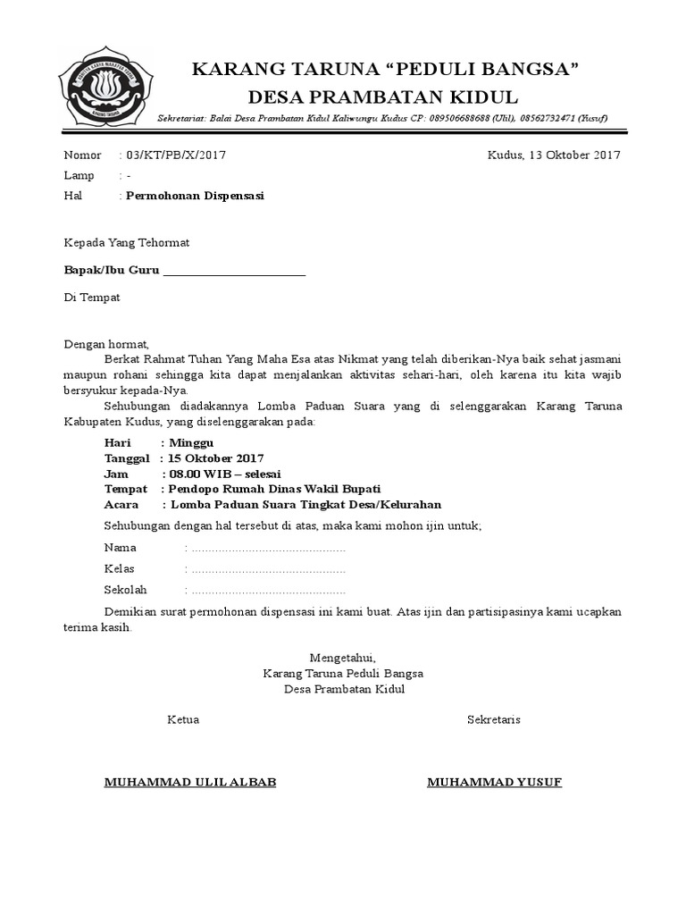 Contoh surat dispensasi untuk guru. Isi dari surat dinas adalah permasalahan kedinasan seperti pemberitahuan suatu izin penugasan menyampaikan pengumuman permohonan dan lain lain. Di bawah ini adalah contoh surat dispensasi yang diberikan kepada kepala sekolah untuk dapat mengikuti kegiatan 17 agustus. Contoh surat dispensasi sekolah untuk mengikuti acarasurat dispensasi adalah surat yang dibuat untuk dapat diberikan kepada seseorang ataupun kelompok perusahaan instansi sekolah lembaga dll agar si pembuat surat diperkenankan untuk meninggalkan tugas utamanya sementara karena ada tugas atau kegiatan yang lebih penting. 15 contoh surat dispensasi resmi untuk berbagai tujuan berbicara mengenai dispensasi tentu akan sangat erat kaitannya dengan tanggung jawab ataupun tugas utama kita. Berdasar dari hal tersebut maka kita bisa menyimpulkan tujuan dari surat dispensasi yakni untuk memberikan keringanan atas tanggung jawab yang seharunya kita kerjakan atau kita jalankan. Contoh surat dispensasi surat dispensasi adalah surat yang dibuat untuk diberikan kepada seseorang ataupun kelompok perusahaan instansi sekolah lembaga dll agar si pembuat surat diperkenankan meninggalkan tugas utamanya sementara karena ada tugas atau kegiatan yang lebih penting.