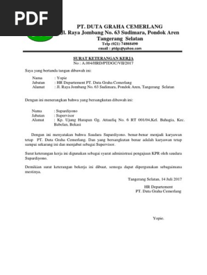 Nah anda bisa meniru contoh pembuatan surat kerja tersebut di atas. Yang pasti seperti itu kira kira kalimat yang digunakan untuk membuat surat keterangan kerja. Download contoh surat keterangan kerja untuk kpr doc. Contoh surat keterangan kerja sebuah surat keterangan kerja sangatlah dibutuhkan untuk memberikan penjelasan kepada seseorang instansi maupun perusahaan tempat bekerja agar dapat menerangkan memberikan penjelasan tentang suatu hal yang terkait misalnya kecakapan prilaku maupun lama pengabdian. Pengajuan kpr mensyaratkan surat keterangan kerja untuk memastikan status kepegawaian apakah pegawai tetap atau kontrak serta untuk memastikan masa kerja anda. Ada banyak contoh surat keterangan kerja yang mungkin seringkali kita temui.
