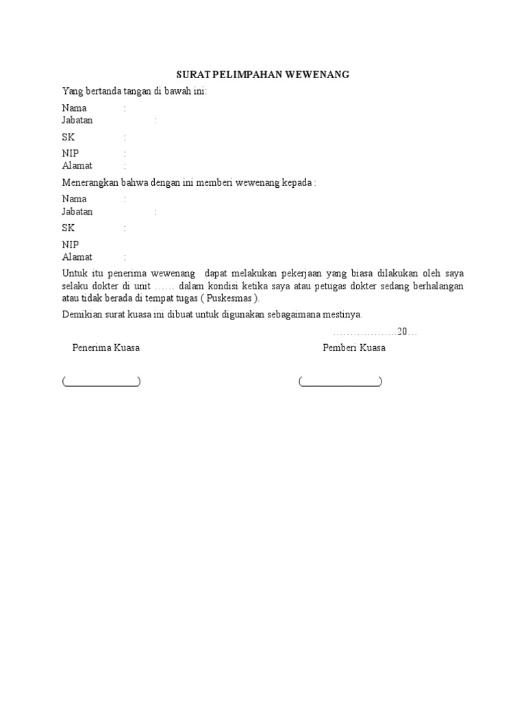 Contoh surat kuasa pelimpahan wewenang. Dalam hukum administrasi dikenal 3 tiga. Karenanya ia bisa memberi pelimpahan wewenang pada orang lain dengan dibuktikan dengan surat pelimpahan wewenang atau umum di kenal dengan surat kuasa. Dwi bahagia f phd spak jabatan. Contoh surat kuasa bank dalam dunia perbankan surat kuasa bukanlah sesuatu hal yang jarang. Dalam surat pelimpahan ini perlu diuraikan secara jelas tugas tugas yang dilimpahkan dan tugas tugas maupun wewenang yang tidak boleh diambil. Orang yang diberi kuasa tersebut akan menggantikan pemberi kuasa dalam berbagai tujuan maupun pekerjaan.