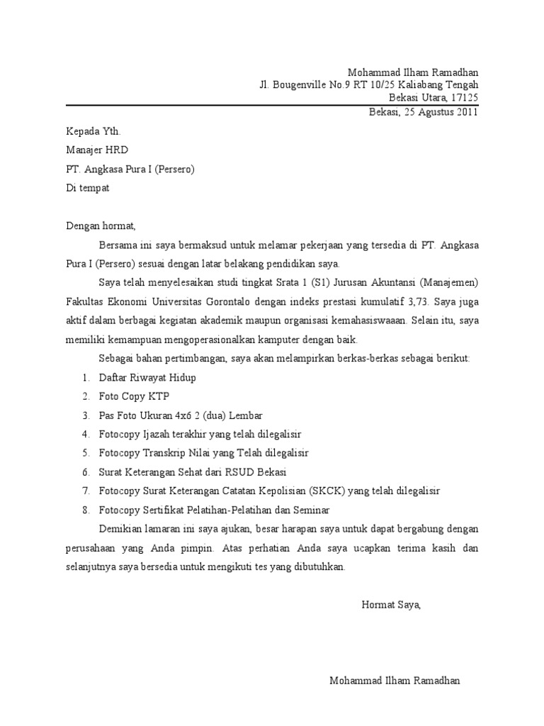 Angkasa pura i persero sesuai dengan latar belakang pendidikan saya. Saya telah menyelesaikan studi tingkat srata 1 s1 jurusan akuntansi manajemen fakultas ekonomi universitas gorontalo dengan indeks prestasi kumulatif 373. Contoh surat lamaran kerja adalah suatu hal yang sangat dibutuhkan oleh para orang yang sedang mencari pekerjaan yang sesuai dengan keinginannya. Surat lamaran kerja pt angkasa pura 1 semua pekerjaan adalah sesuatu yang mulia sebab bekerja untuk menafkahi diri sendiri merupakan arti hidup yang kudu dihadapi. Dalam contoh surat lamaran kerja angkasa pura gawe cv telah memilihkan tema atau template yang terbaik untuk dijadikan inspirasi ide ataupun acuan dalam penulisan surat anda. Contoh surat lamaran kerja angkasa pura merupakan contoh gratis pada pembahasan contoh surat yang di posting oleh gawe cv.