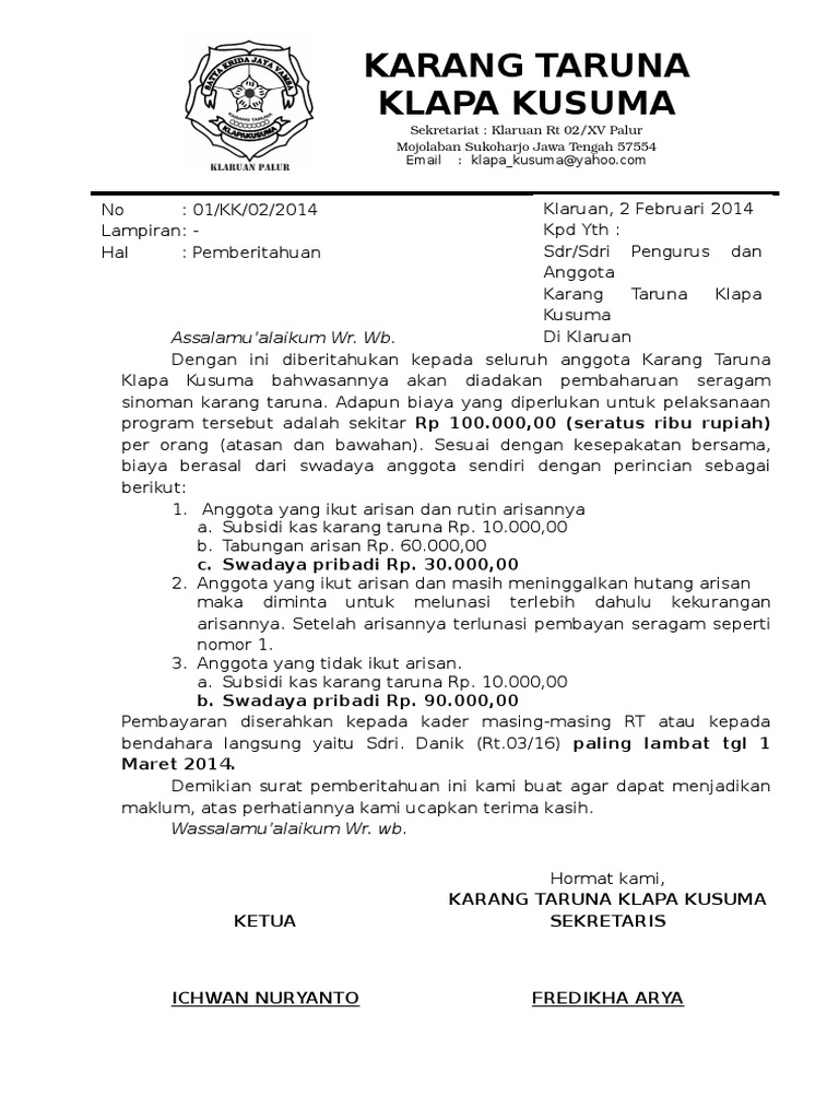 Surat pemberitahuan kepada wali santri rekan rekanita di tempat assalamualaikum wrwb untuk memperlancar kegiatan keorganisasian remaja islam masjid al barokah rismakami dari.