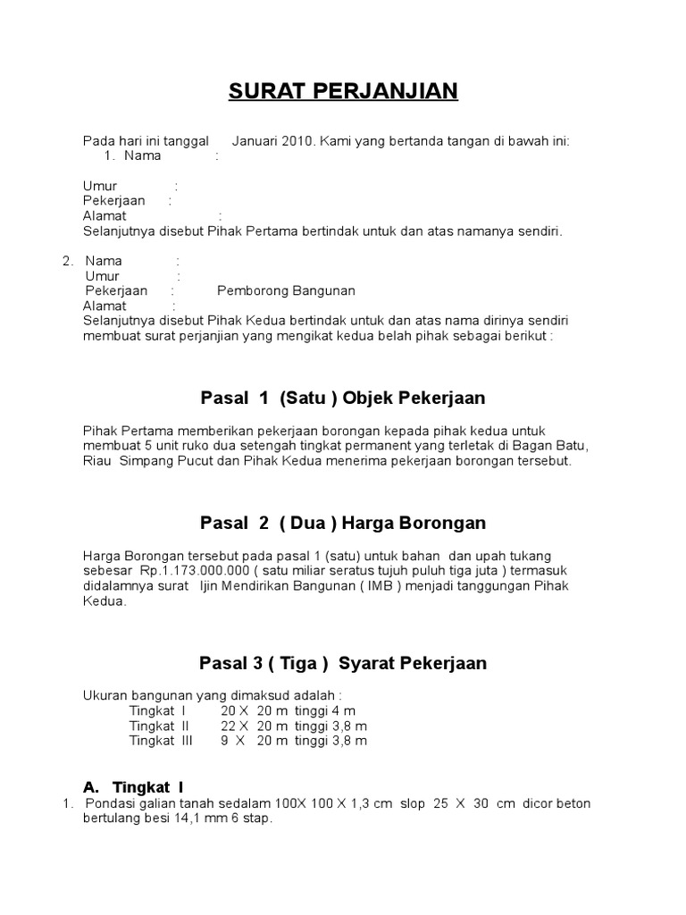 Contoh surat perjanjian kerja borongan bangunan doc. Kedua belah pihak beritikad baik untuk melaksanakan surat perjanjian pemborongan pekerjaan ini sesuai dengan isinya. Demikian surat perjanjian ini dibuat rangkap 2 dua masing masing bermaterai cukup yang mempunyai kekuatan hukum yang sama yang dipegang oleh masing masing pihak dan berlaku sejak ditanda tangani surat perjanjian ini. 15 contoh surat pengunduran d. Pihak kedua harus menyelesaikan pekerjaan seperti terlampir dalam uraian pekerjaan selama 60 enam puluh hari kerja dan tidak dapat dirubah oleh pihak kedua kecuali karena keadaan force majeure seperti yang dijelaskan dalam pasal 11 dalam surat perjanjian ini dan atau karena pekerjaan tambah kurang sesuai dalam pasal 14 surat perjanjian ini yang dinyatakan secara tertulis dalam berita. Berikut gambar gambar mengenai contoh surat perjanjian kerja borongan bangunan doc. Jika dalam menjalankan surat perjanjian kontrak kerja ini terdapat perselisihan atau perbedaan pendapat maka kedua belah pihak akan menempuh jalan musyawarah mufakat.