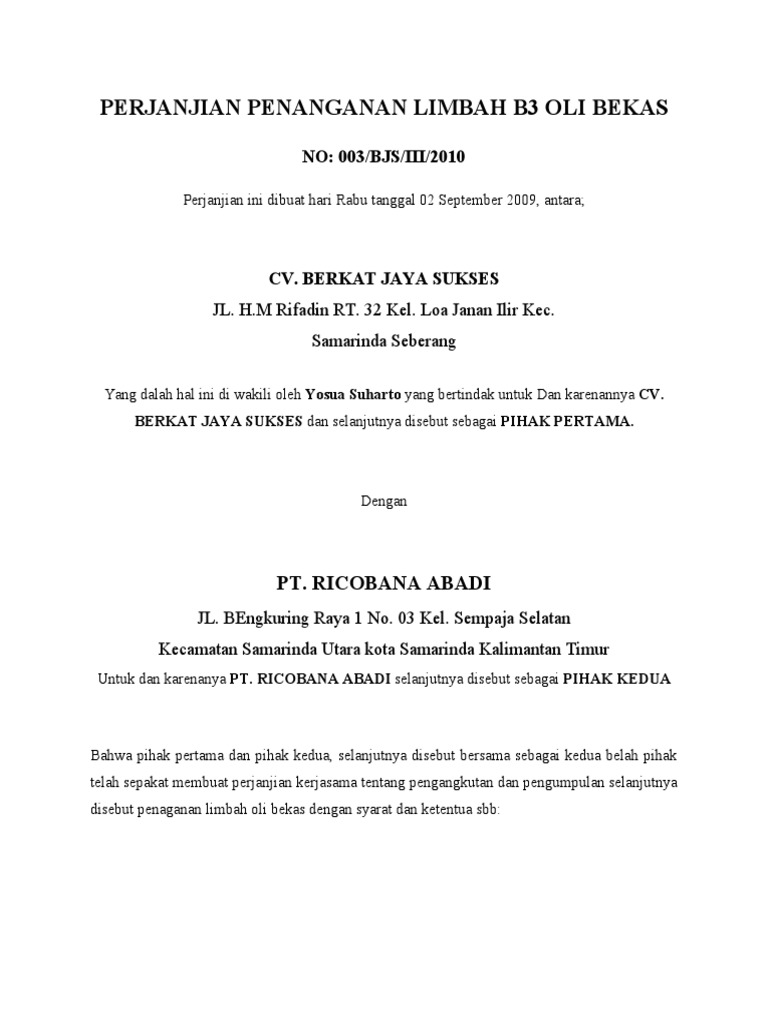 Contoh surat perjanjian kerjasama pengelolaan sampah. Download contoh surat kerjasama bagi hasil doc. 15 contoh surat perjanjian kerjasama berbagai bidang sebagai suatu perusahaan yang ingin cepat berkembang maka tentu sebuah perusahaan tidak bisa berdiri sendiri tanpa ikatan dengan perusahaan lain. Hal ini sebenarnya bukan hal yang baru lagi dimana setiap perusahaan tentu ingin bekerjasama dengan perusahaan perusahaan lain agar bisa saling menguntungkan. Contoh perjanjian jasa pengelolaan limbah medis by. Sekian dulu penjelasan singkat mengenai contoh surat permohonan kerjasama dalam kesempatan kali ini. Mengambil sampah medis benda tajam untuk dibawa ke tps b3 yang sudah penuh atau 23 bagian terisi mengambil semua sampah domestic membersihkan kamar mandi umum membersihkan tempat sampah.