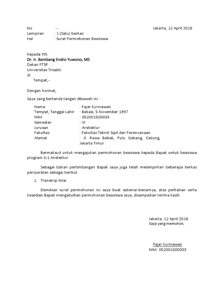 Admin akan sedikit menjelaskan apa itu beasiswa. Surat permohonan berisi tentang sebuah permintaan tentang sesuatu hal kepada pihak yang bersangkutan perseorangan badan atau lembaga organisasi perusahaan atau instansi dan lainnya. Atas perhatian dan bantuan bapak ibu saya ucapkan terima kasih. Demikian surat permohonan ini saya ajukan untuk dapat diterima. Contoh surat permohonan beasiswa merupakan surat yang isinya meminta beasiswa. Contoh surat permohonan beasiswa.