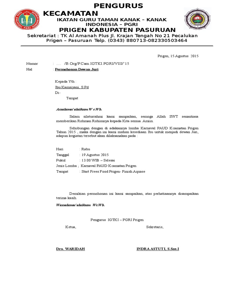 001 ph hut ri 8 rm viii 2013 lamongan 18 agustus 2013 hal. Itulah informasi mengenai contoh surat undangan juri lomba membuat surat undangan juri lomba. Nah sekarang materi anak pramuka akan bagiin tetang surat lagi kali ini tentang surat permohonan menjadi juri. Desa mendalok kecamatan sungai kunyit.