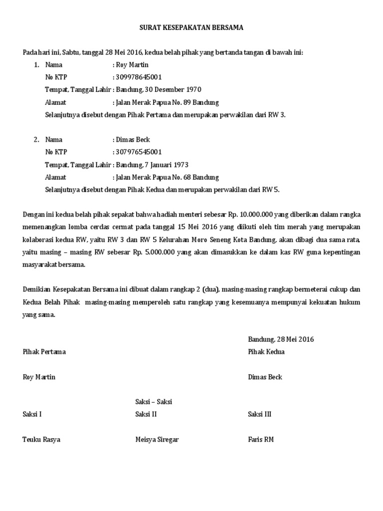 Pernyataan yang diberikan secara lisan sering kali sulit untuk diingat dengan secara rinci. Contoh surat kesepakatan bersama surat kesepakatan bersama adalah surat yang berisi kesepakatan atau perjanjian yang dilakukan beberapa orang atau golongan. Namun untuk urusan komunikasi perusahaan maupun berbagai lembaga maupun instansi pemerintah penggunaan surat masih merupakan sesuatu hal yang wajib untuk dilakoni. Untuk lebih jelas sebaiknya perhatikan contoh surat pernyataan dari beberapa fungsi. Bagi anda yang ingin membuat surat ini anda harus memperhatikan mengenai beberapa ketentuan yang ada seperti diksi bahasa yang digunakan maupun juga format.