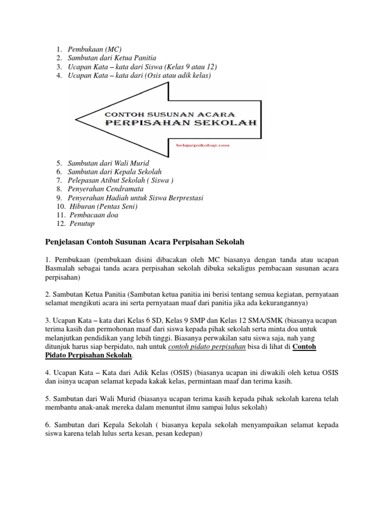 1pembukaan 2sambutan sambutan kepala sekolah ketua komite ketua osis 3acara inti prosesi perpisahan kelas 9 4hiburan dari murid kelas 7 dan 8 5penutup. Contoh susunan acara perpisahan sekolah. Maka dengan adanya susunan acara juga. Pada setiap akhir tahun pelajaran hampir dipastikan di setiap sekolah madrasah akan diadakan kegiatan perpisahan pada kelas paling tinggi yang akan meninggalkan sekolah karena telah tamatlulus dalam menempuh pendidikan dari sekolahmadrasah bersangkutan yakni untuk sdmi kelas 6 smpmts kelas 9 dan juga smasmkma untuk kelas 12. Tabel di bawah ini merupakan contoh susunan acara perpisahan sederhana yang bisa kamu jadikan contoh dalam menyusun sebuah acara perpisahan. Nah itulah contoh susunan acara perpisahan sekolah yang bisa dijadikan referensi.