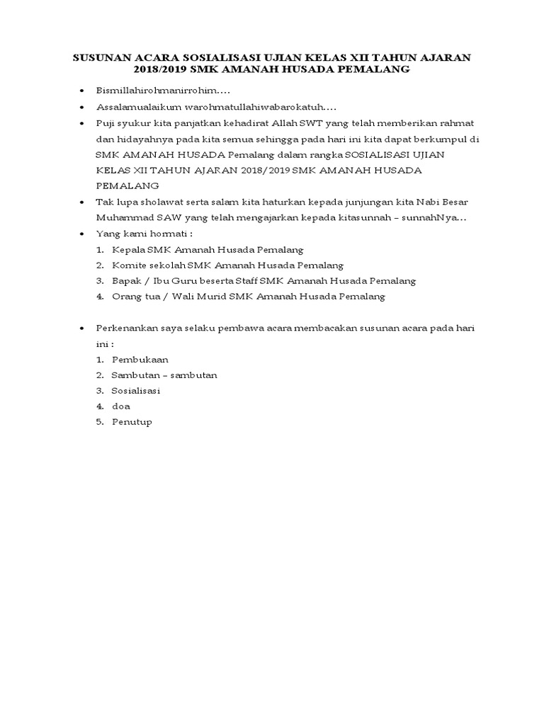 Susunan acara pembukaan penyelenggaraan sosialisasi dan pembinaan kurikulum 2013 terpadu. Contoh berita acara dalam sebuah acara terutama untuk acara acara formal pasti tak asing dengan dokumen yang dinamakan berita acara. Contoh susunan acara sosialisasi. Dalam pembukaan opening speech disebut juga welcome speech seorang mc harus mengucapkan salam mengenalkan diri sebut nama menyambut dan mengucapkan terima. Contoh rundown acara gathering hari ke 1.