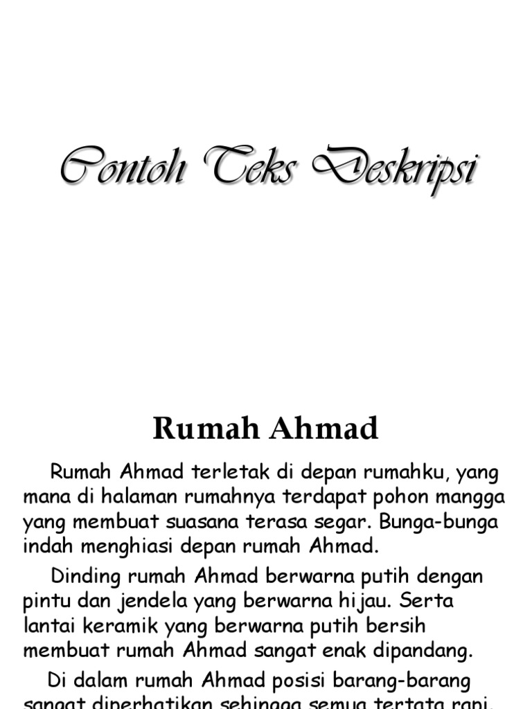 Rumahku adalah rumah mungil di depan mushola. Contoh teks deskripsi ketika kita ingin mengetahui informasi rinci mengenai suatu objek yang bisa berupa barang maupun lainnya padahal kita belum pernah melihatnya secara langsung disitu lah kita butuh teks deskripsi.