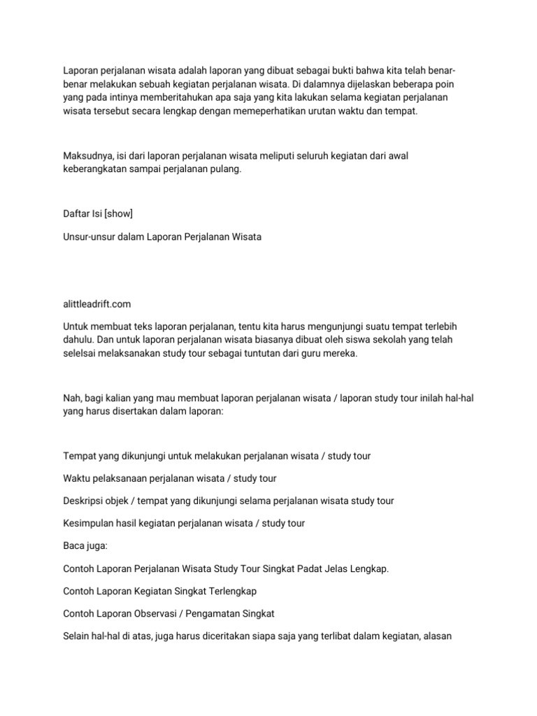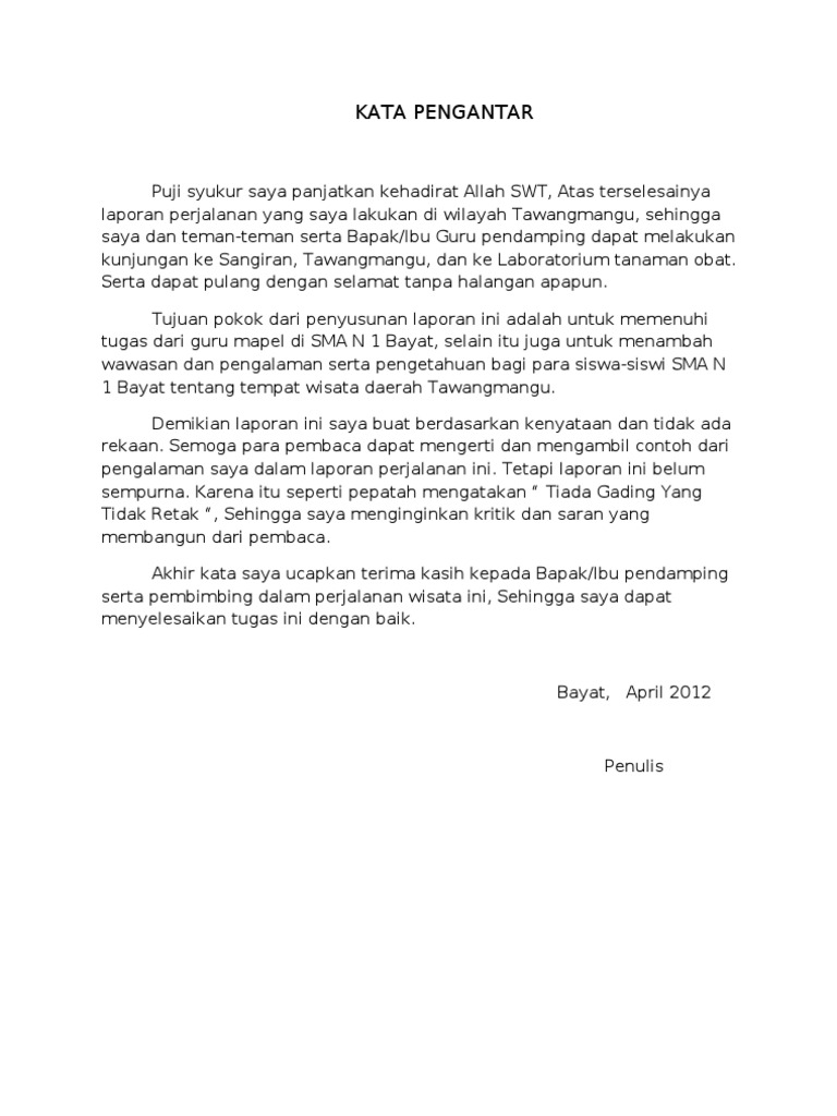 Berikut disajikan contoh laporan kegiatan mengenai perjalanan singkat yang telah dilaksanakan oleh siswa. Contoh teks ucapan alu aluan contoh teks ucapan hari sukan contoh teks ucapan pengerusi majlis kursus contoh teks ucapan majlis penutup k. Untuk membuat teks laporan perjalanan wisata hal yang pasti kamu harus mengunjungi suatu tempat terlebih dahulu. Laporan perjalanan laporan perjalanan wisata adalah laporan yang disusun setelah kegiatan study tour maupun field trip yang dilaksanakan oleh beberapa sekolah atau universitas. Untuk itu penulis tidak lupa menyampaikan bayak terima kasih kepada semua pihak yang telah membantu penulis dalam pembuatan makalah ini. Perjalanan ini memang sangat melelahkan namun dibalik itu semua terdapat sebuah pengalaman yang tidak pernah akan kami lupakan selama hidup kamidari penulisan laporan inipenulis dapat menyimpulkan bahwa obyek obyek wisata di indonesia beraneka ragamsebagai warga negara yang baik sudah sepantasnya kita menjaganya agar tetap lestari dan wisatawan domestik maupun mancanegara betah di.