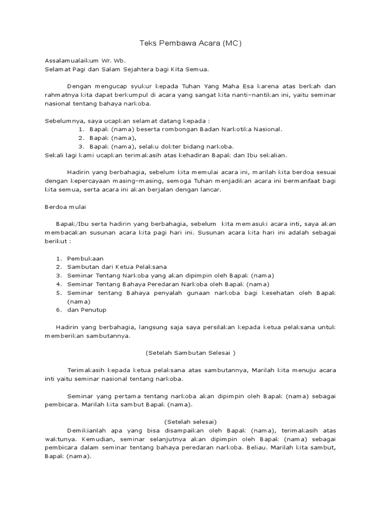 Pada kesempatan kali ini kami akan memberikan contoh lengkap naskah mc pembawa acara untuk seminar nasional yang sudah lengkap bahasa indonesia. Wb salam sejahtera untuk kita semua yang terhormat dekan fakultas keguruan dan ilmu pendidikan universitas pancasakti tegal atau yang mewakili beserta jajarannya yang saya hormati ketua program studi pendidikan matematika universitas pancasakti tegal. Kami disini akan selalu memberikan refrensi ataupun contoh untuk sobatku yang masih kebingunan dalam penulisan ataupun pembuatan naskah pembawa acara yang sesungguhnya. 1 1 mendukung tandai dokumen ini sebagai bermanfaat 1 1 menolak tandai dokumen ini sebagai tidak bermanfaat tanamkan. Begini contoh naskah mc semi formal acara seminar nasional 10 oktober 2018 1428 diperbarui. Yang terhormat bupati jepara atau yang diwakili kepala dinas pendidikan dan pemuda olahraga.
