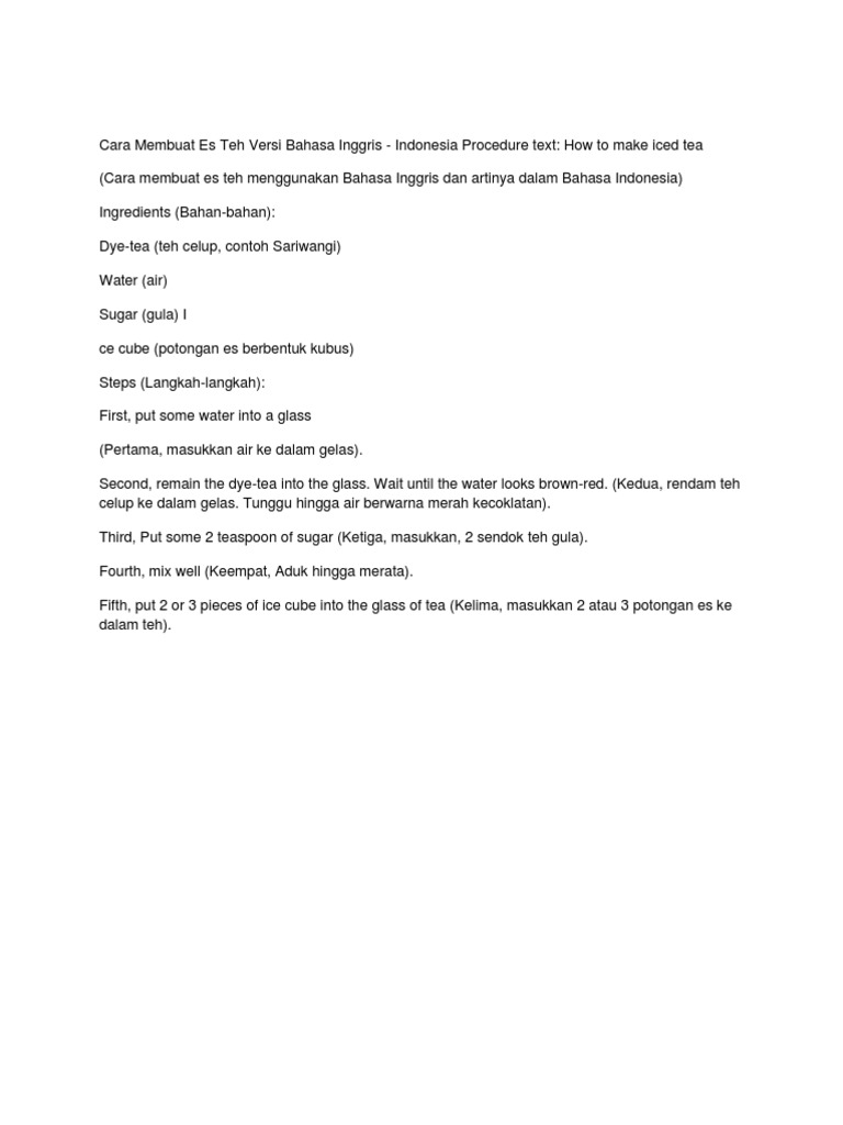 Semoga semua sehat dan terjaga selalu aktifitasnya. Biasanya guru menjelaskan bab procedure text lalu menyuruh siswanya untuk membuat contoh procedure text dalam bahasa inggris. Teks prosedur atau procedure text adalah jenis teks dalam bahasa inggris yang bertujuan menggambarkan bagaimana sesuatu itu terjadi melalui serangkaian aksi atau langkah langkah yang berurutan. Artikel selengkapnya bisa dibaca pada sumber gambar. Unknown 12 oktober 2019 2314. Kali ini daminesiadotcom akan membahaskan tentang materi bahasa indonesia yang berisi contoh bahasa inggris juga.