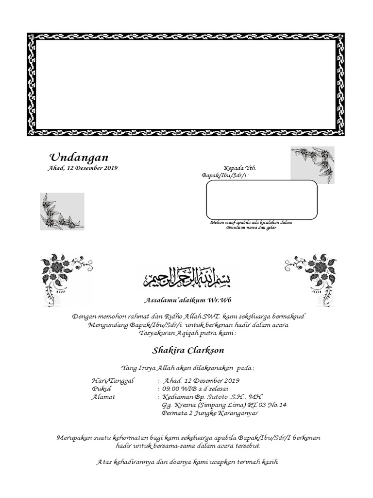 Pada file microsoft word yang mimin berikan silahkan dikostumisasi diedit red sesuai kebutuhan. Contoh undangan aqiqah aqiqah adalah hewan sembelihan untuk anak laki laki atau perempuan yang baru lahir sebagai wujud rasa syukur kita kepada allah swt atas karunia terindah yang telah ia berikan. Secara bahasa aqiqah berarti rambut yang berada di kepala bayi yang baru dilahirkan dan aqiqah juga berarti pemotongan. Berikut ini contoh desain kartu undangan aqiqah terbaru yang penulis dapatkan kembali dari berbagai sumber. Carousel previous carousel next. Save save contoh undangan aqiqahdocx for later.