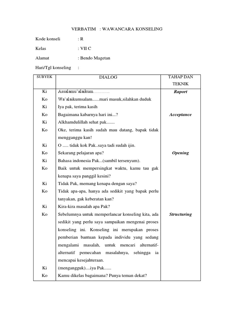Contoh verbatim konseling individu. Contoh verbatim konseling individual ret rational emotif therapy. Berikut adalah contoh dari verbatim atau dialog konseling individual menggunakan pendekatan behavioral. Nah itu namanya konseling vitojadi saya jelaskan sedikit ya mengenai konseling itu apakonseling ini bertujuan untuk membantu konseli memecahkan masalahnya dan pilihan terakhir ditangan konseli itu sendiri dan azas yang digunakan antara lain pertama azas kerahasiaan dimana permasalahan anda hanya kita berdua yang mengetahuinya yang kedua azas keterbukaan dimana konseli atau anda. Pelajar kelas 3 sma umur. Laki laki tempattgl lahir. Konseling itu dilandasi oleh asas asas seperti kerahasiaan kesukarelaan keahlian kegiatan kemandirian dan masih banyak yang lain.